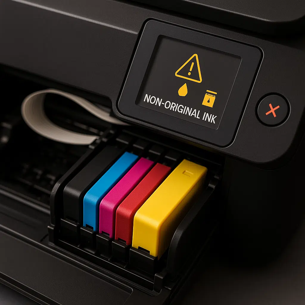 Le stampanti moderne, soprattutto HP, Epson e Brother, sono programmate per rilevare chip o codici identificativi. Quando non trovano un chip “ufficiale”, mostrano un avviso.